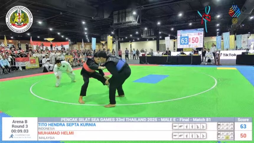 Thailand (17/12) – Pesilat PERSINAS ASAD atas nama Muhamad Helmi (sudut merah) asal Malaysia sukses menembus partai final cabang olahraga pencak silat SEA Games ke-33 Thailand 2025. Helmi tampil di kelas E putra dan berhadapan dengan pesilat Indonesia, Tito Hendra Septa Kurnia (sudut biru), pada partai ke-81.