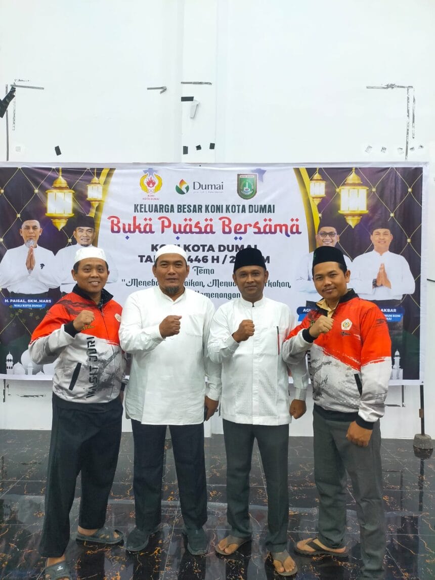 Dumai (23/03) – Komite Olahraga Nasional Indonesia (KONI) Kota Dumai menggelar buka puasa bersama Wakil Wali Kota Dumai, H. Sugiyarto, di Gedung Serba Guna (GSG) Dumai Islamic Center, Minggu (23/3/2025). Acara ini dihadiri tokoh adat Melayu dari Lembaga Adat Melayu (LAM) Dumai serta perwakilan seluruh cabang olahraga (cabor) se-Kota Dumai.